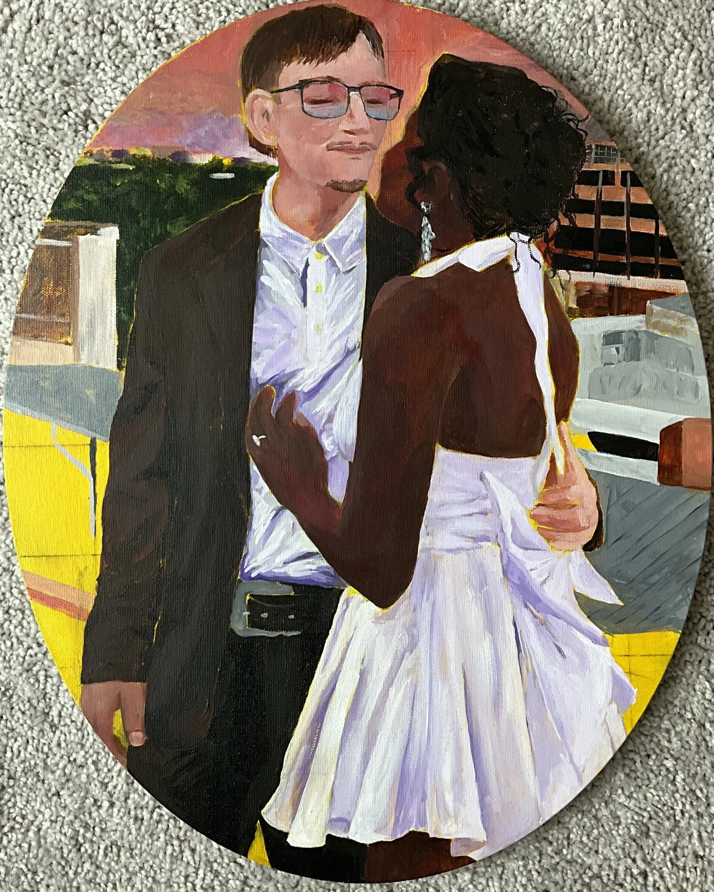 You Complete Me Acrylic on Canvas | 16” x 20” | 2026 This is a painting of My partner and I in a loving embrace at our engagement party.
